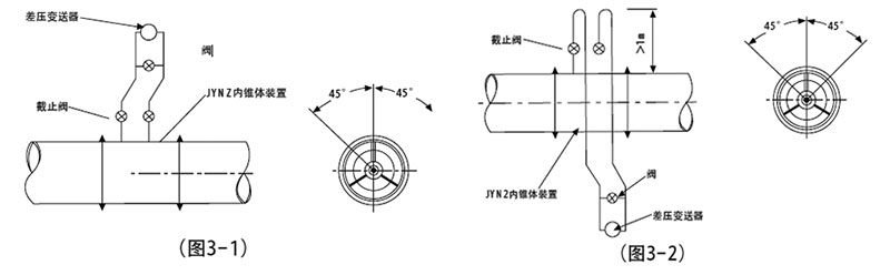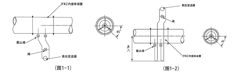 b)如果变送器不得不安装在内锥体装置的上方(图1.2),为了减少液体中的气 体进入导压管内,应在内锥体装置和导压管之间装U型弯管,且弯头下端至少   低于管道中心1米。