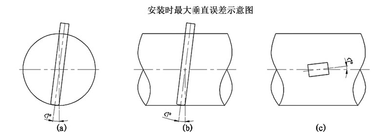 插入式匀速管传感器安装时除了高压孔应正对流速方向外,必须保证传感器检测杆与工艺管道的轴线垂直,夹角偏差应小于7°(图a);传感器总压孔中心与管道轴线夹角应小于7°(图b);检测杆沿管道直径方向插入到底部,其角度偏差小于7°(图c)。
