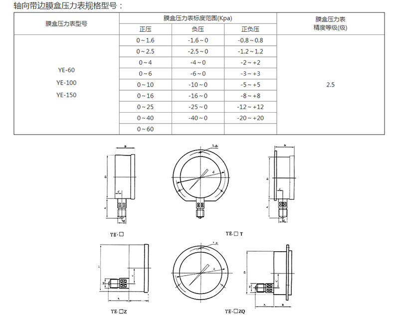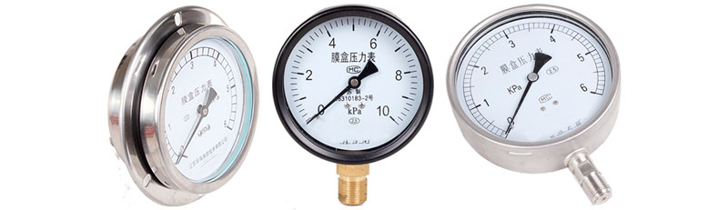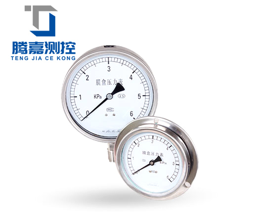 膜盒压力表由测量系统(包括接头、波纹膜盒等),传动机构(包括拔杆机构,齿轮传动机构),指示部件(包括指针与度盘)和外壳(包括表壳、衬圈和表玻璃)所组成。仪表的工作原理是基于波纹膜盒在被测介质的压力作用下,其自由端产生相应的弹性变形,再经齿轮传动机构的传动并予放大,由固定于齿轮轴上的指针逐将被测值在度盘上指示出来。还有调零装置,可以方便调整零位。