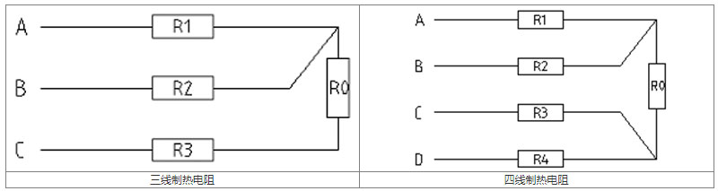 如上图所示,不管四根引线的电阻R1、R2、R3、R4是否相等,测温元件电阻R0都与引线电阻的大小无关,并可表达为:R0=(RAD+RBC-RAB-RCD)/2。