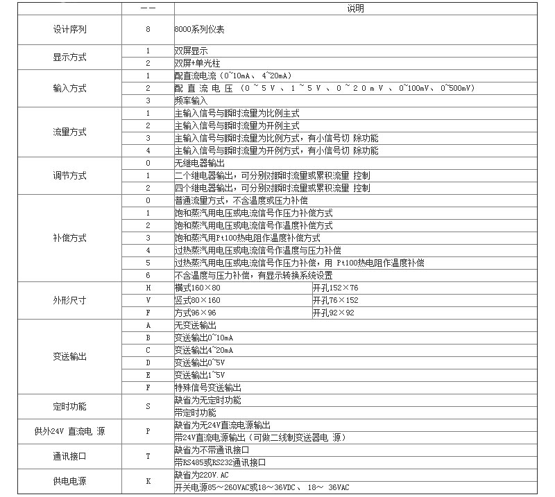 1.测量精度:±0.5%FS+1字 2.调节控制精度:位式:±0.5%FS 3.报警功能:上限、廿限、上下限、下回差、双回差、OK方式、绝对值方式等 4.变送输出精度:±0.5%FS 负载能力:0-600Ω 5.输入阻抗:0-10mA:500Ω、4-20mA:250Ω、DC.V:≥200KΩ 脉冲幅值:≥2.5V,频率范围 0.01-10000Hz 6.继电器接点容量:AC220V 2A 7.供电电源:AC220V≤6W AC110V DC24V 8.工作环境要求:温度:0-50℃、相对湿度:<85%,无腐蚀性气体,允许低震动场合